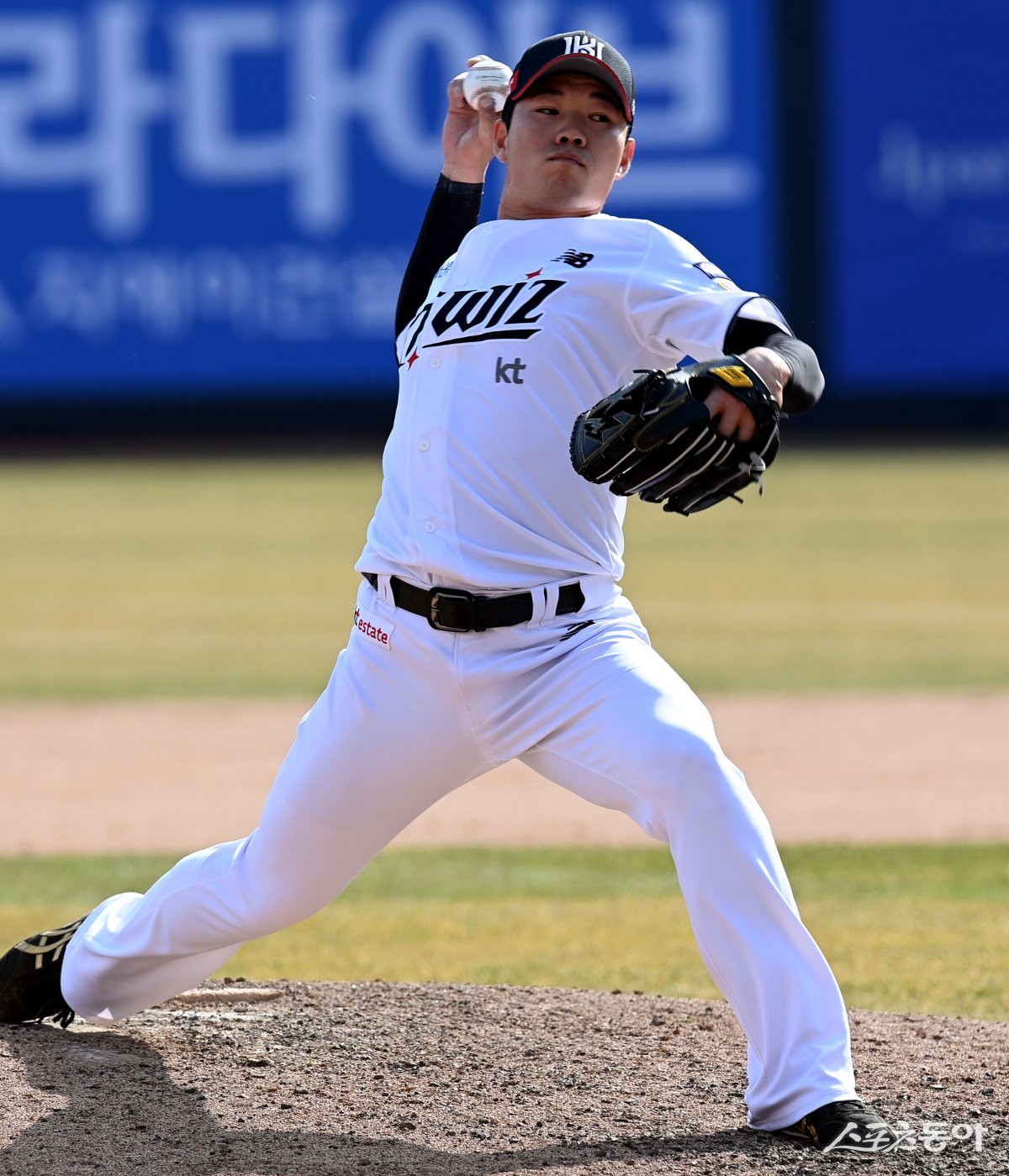 18일 경기도 수원 KT위즈파크에서 ‘2024 신한 SOL 뱅크 KBO리그’ KT 위즈와 롯데 자이언츠의 시범경기가 열렸다. 9회초 무사에서 KT 이상동이 구원 등판해 볼을 던지고 있다. 수원 | 김민성 기자 marineboy@donga.com