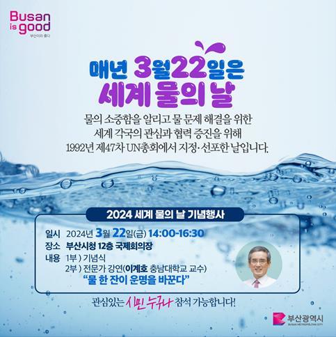 부산시가 시 상수도사업본부와 UN에서 지정한 3월 22일 세계 물의 날을 맞아 다채로운 기념행사를 개최한다고 18일 밝혔다.물 절약 실천 SNS 이벤트 진행