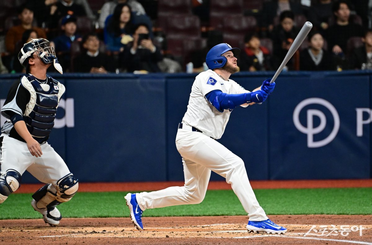 18일 서울 고척스카이돔에서 열린 팀 코리아와 로스앤젤레스(LA) 다저스의 미국 프로야구(MLB) 서울시리즈 연습 경기. 1회말 2사 1,2루 상황에서 LA 다저스 맥스 먼시가 1타점 적시타를 치고 있다.