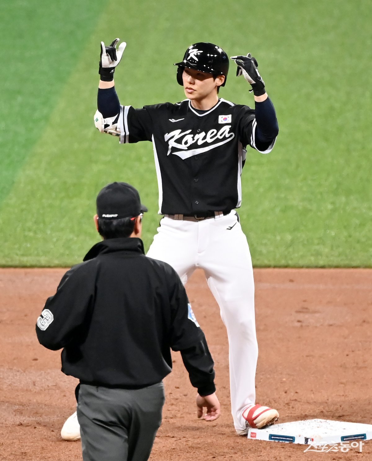 18일 서울 고척스카이돔에서 열린 팀 코리아와 로스앤젤레스(LA) 다저스의 미국 프로야구(MLB) 서울시리즈 연습 경기, 3회초 무사 1루 팀 코리아 김혜성이 2루타를 때려낸 뒤 세리머니를 하고 있다.