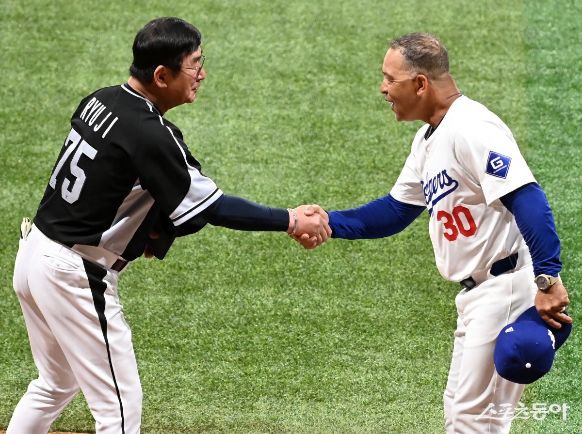 18일 서울 고척스카이돔에서 ‘메이저리그 월드투어 서울시리즈 2024’ 스페셜 매치 팀 코리아와 LA 다저스 경기가 열렸다. 팀 코리아 류중일 감독과 LA 다저스 로버츠 감독이 인사를 하고 있다.