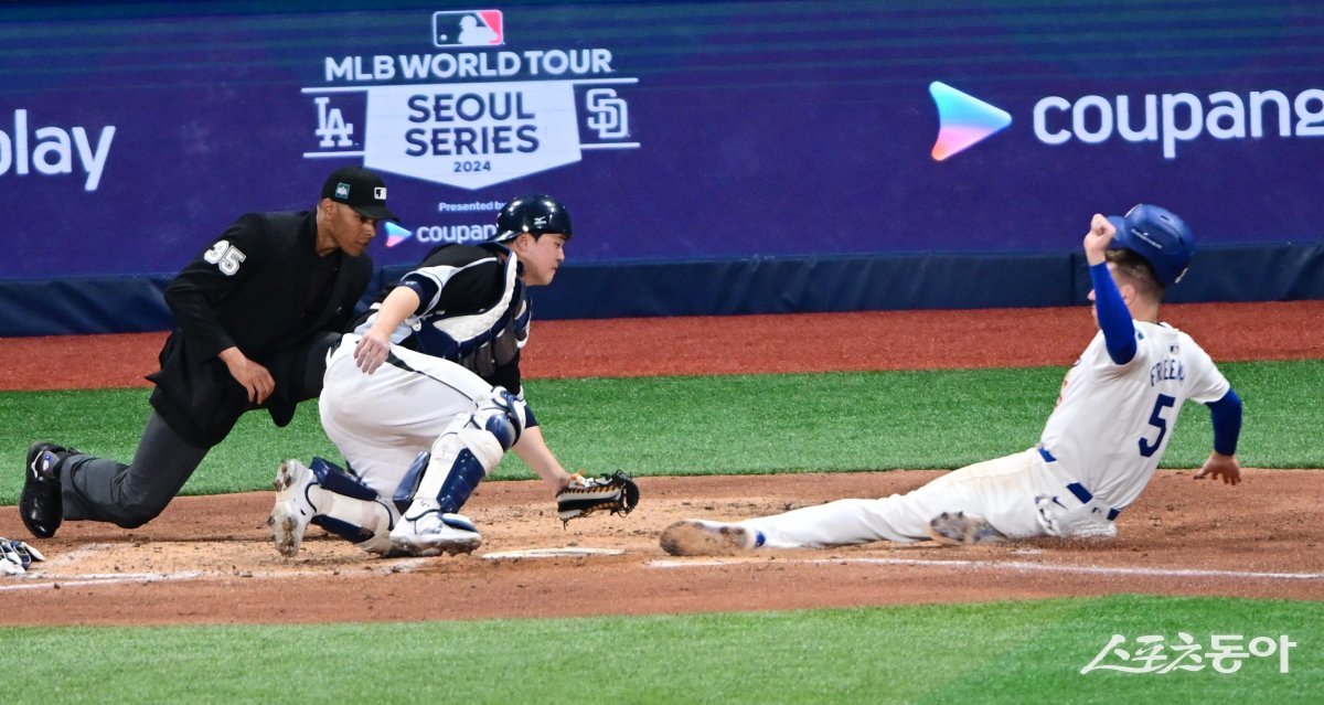 18일 서울 고척스카이돔에서 ‘메이저리그 월드투어 서울시리즈 2024’ 스페셜 매치 팀 코리아와 LA 다저스 경기가 열렸다. 3회말 2사 윌 스미스의 2루타때 1루주자 프리먼이 득점을 올리고 있다.