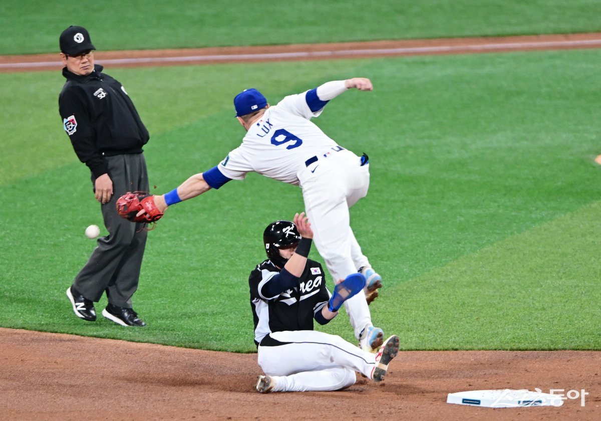 18일 서울 고척스카이돔에서 ‘메이저리그 월드투어 서울시리즈 2024’ 스페셜 매치 팀 코리아와 LA 다저스 경기가 열렸다. 2회초 1루주자 최지훈이 김형준 타석때 2루 도루에 성공하고 있다.