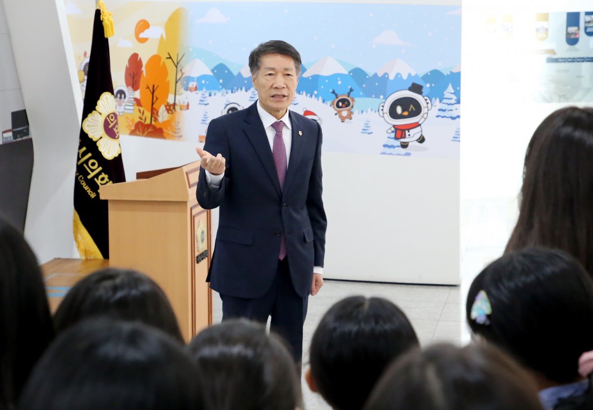 김장권 의원이 지난18일 성남시의회를 방문한 학생들에게 환영 인사를하고 있다. 사진제공ㅣ성남시의회