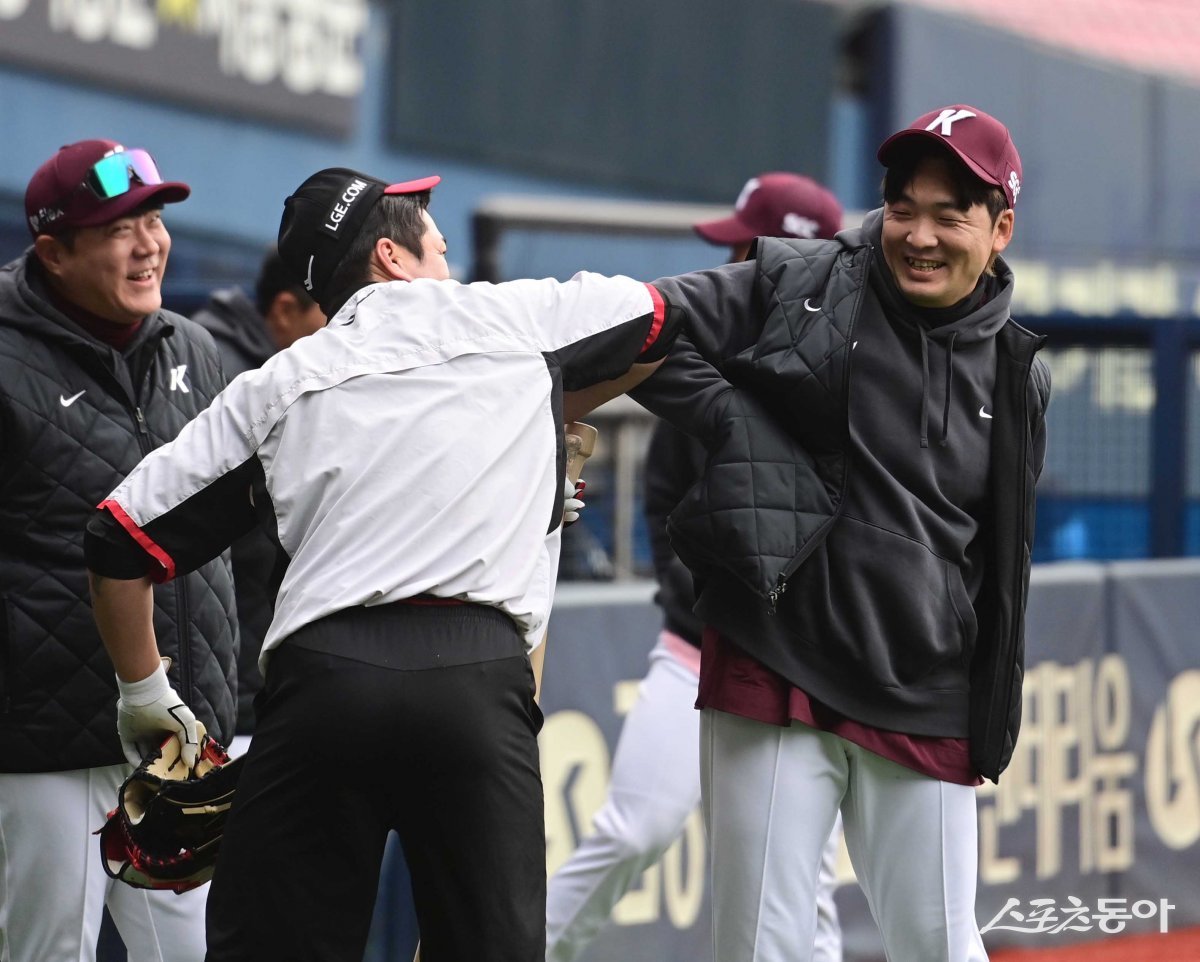 19일 서울 잠실야구장에서 열린 ‘2024 신한 SOL 뱅크 KBO리그’ LG 트윈스와 키움 히어로즈의 시범경기에 앞서 LG 홍창기와 키움 이형종이 장난을 치고 있다.