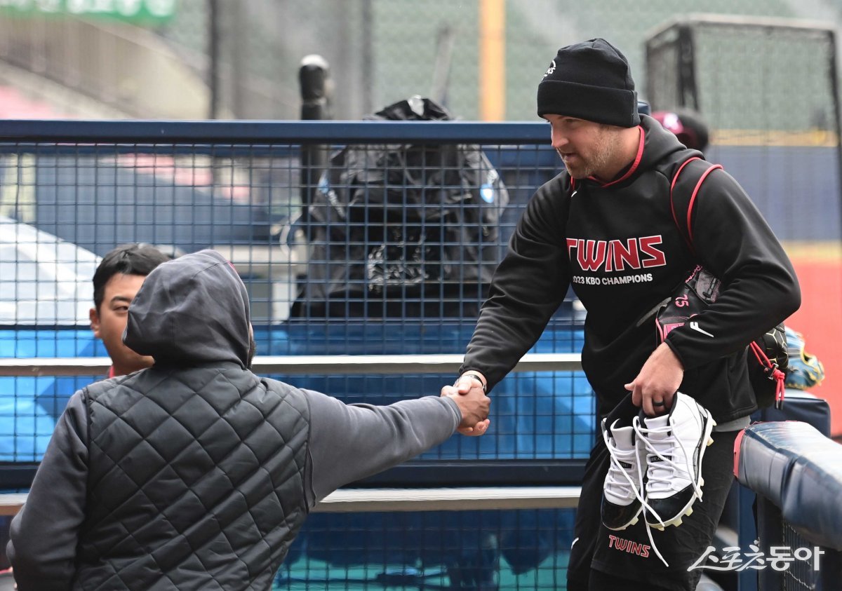 19일 서울 잠실야구장에서 열린 ‘2024 신한 SOL 뱅크 KBO리그’ LG 트윈스와 키움 히어로즈의 시범경기에 앞서 LG 엔스가 키움 선수와 인사하고 있다.