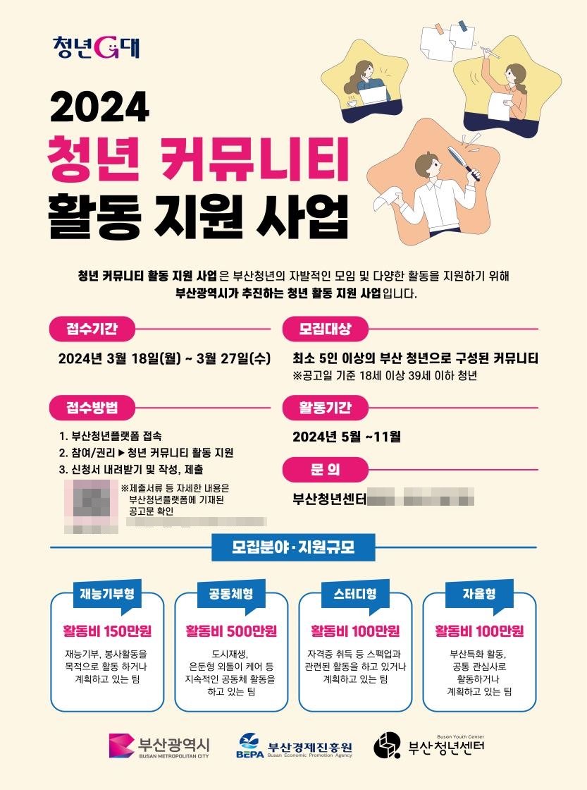 부산시가 오는 27일까지 ‘2024년 청년 커뮤니티 활동 지원사업’ 참여팀을 모집한다고 19일 밝혔다.오는 27일까지 부산청년플랫폼 통해 신청