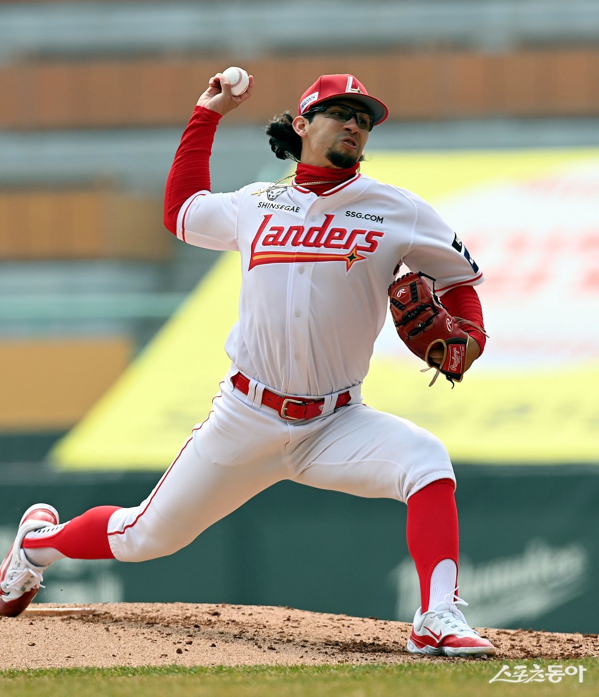 19일 인천 SSG 랜더스필드에서 ‘2024 신한 SOL 뱅크 KBO리그’ SSG 랜더스와 NC 다이노스의 시범경기가 열렸다. SSG 선발투수 더거가 힘차게 볼을 던지고 있다.