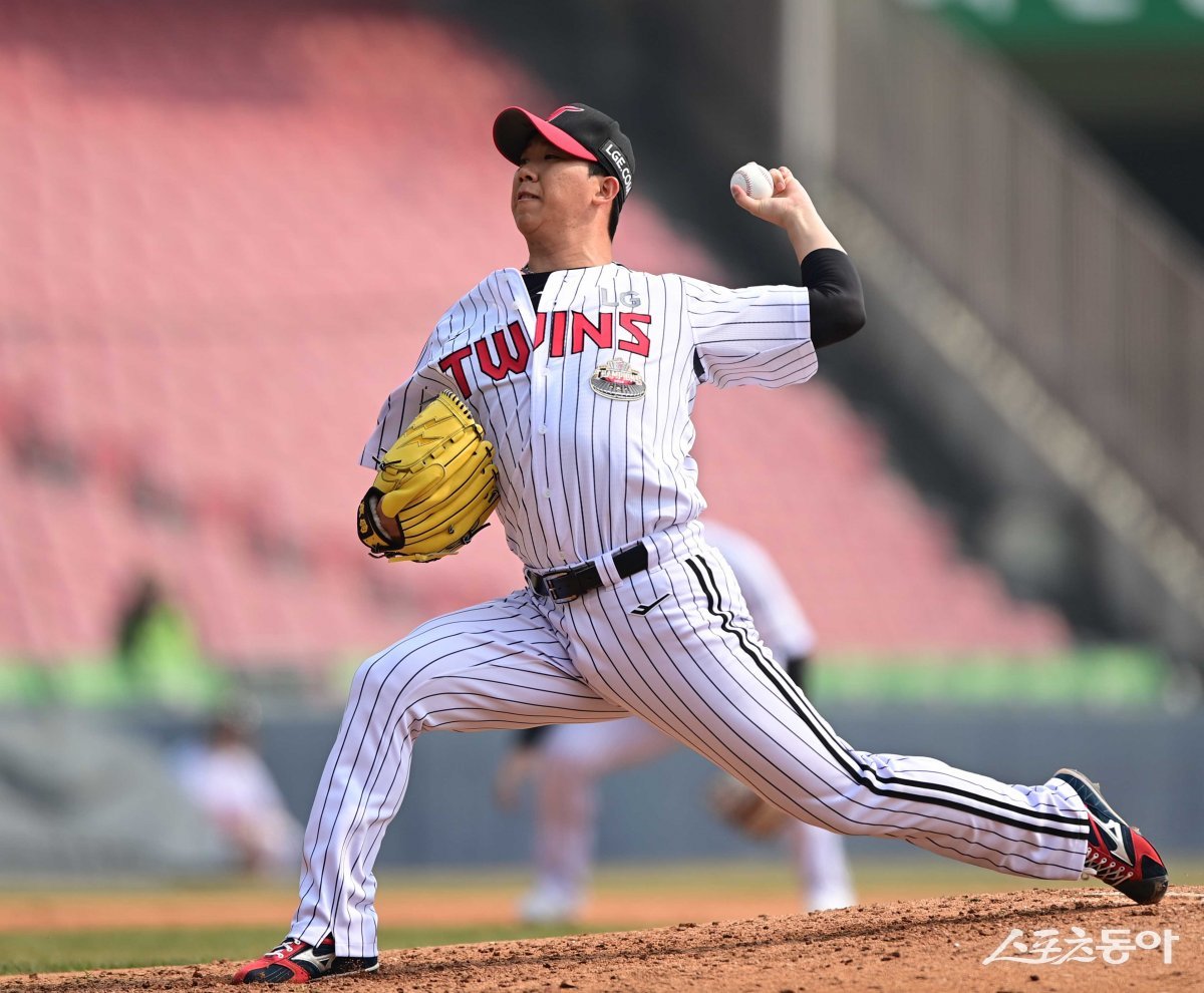 19일 서울 잠실야구장에서 열린 ‘2024 신한 SOL 뱅크 KBO리그’ LG 트윈스와 키움 히어로즈의 시범경기에서 5회초 2사 1, 3루 LG 김유영이 교체로 마운드에 올라 역투하고 있다.