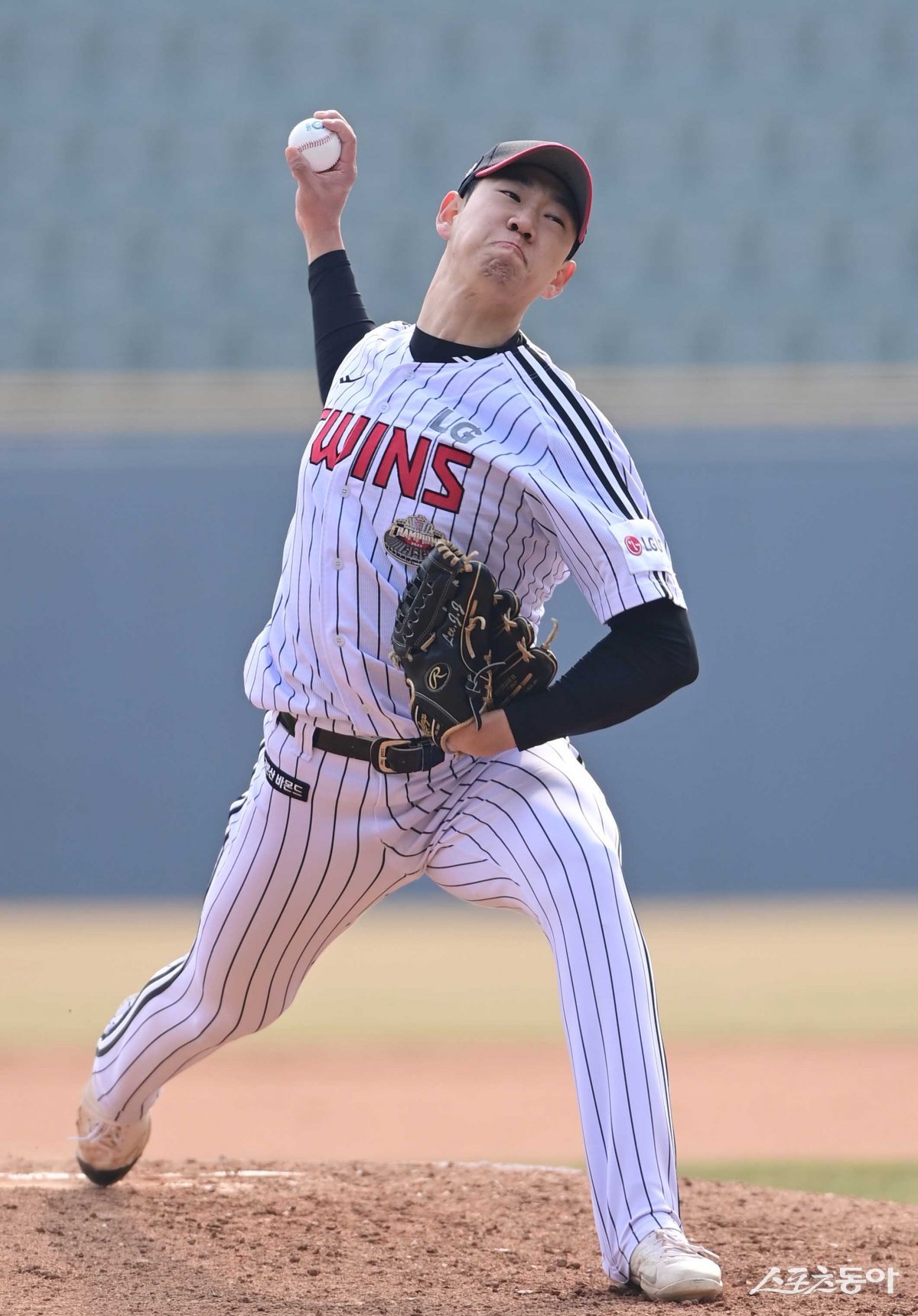 19일 서울 잠실야구장에서 열린 ‘2024 신한 SOL 뱅크 KBO리그’ LG 트윈스와 키움 히어로즈의 시범경기에서 9회초 LG 이종준이 교체로 마운드에 올라 역투하고 있다.