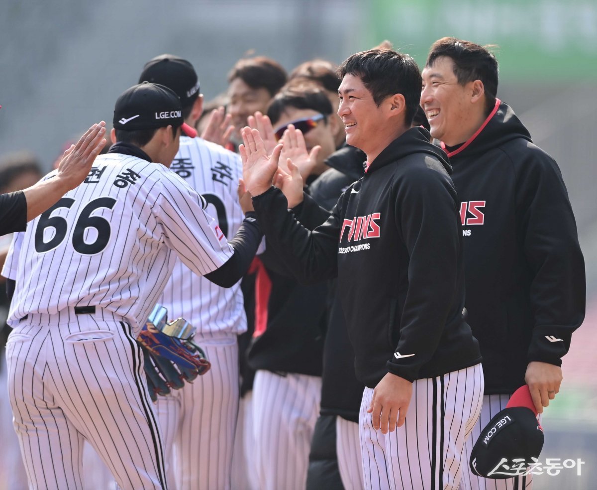 19일 서울 잠실야구장에서 열린 ‘2024 신한 SOL 뱅크 KBO리그’ LG 트윈스와 키움 히어로즈의 시범경기에서 12-1로 승리한 LG 오지환, 김현수과 동료들과 기쁨을 나누고 있다.