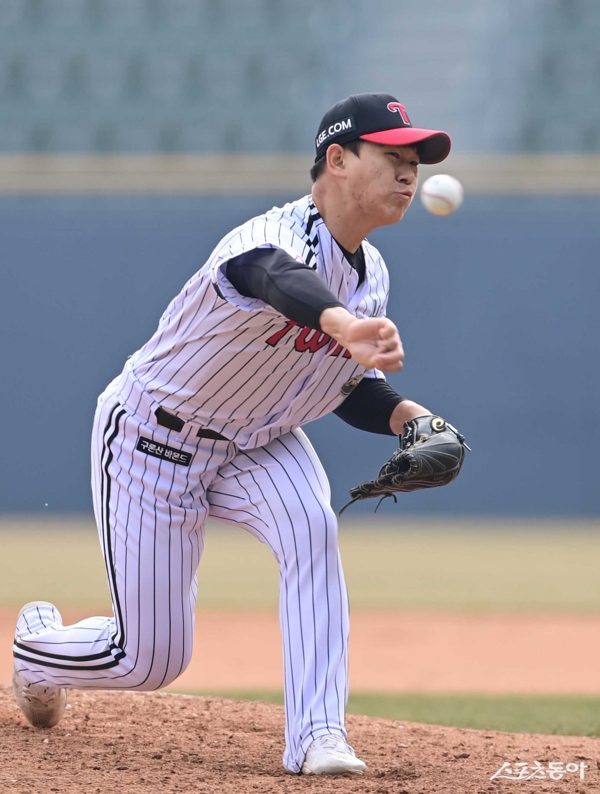 19일 서울 잠실야구장에서 열린 ‘2024 신한 SOL 뱅크 KBO리그’ LG 트윈스와 키움 히어로즈의 시범경기에서 8회초 LG 정지헌이 교체로 마운드에 올라 역투하고 있다.
