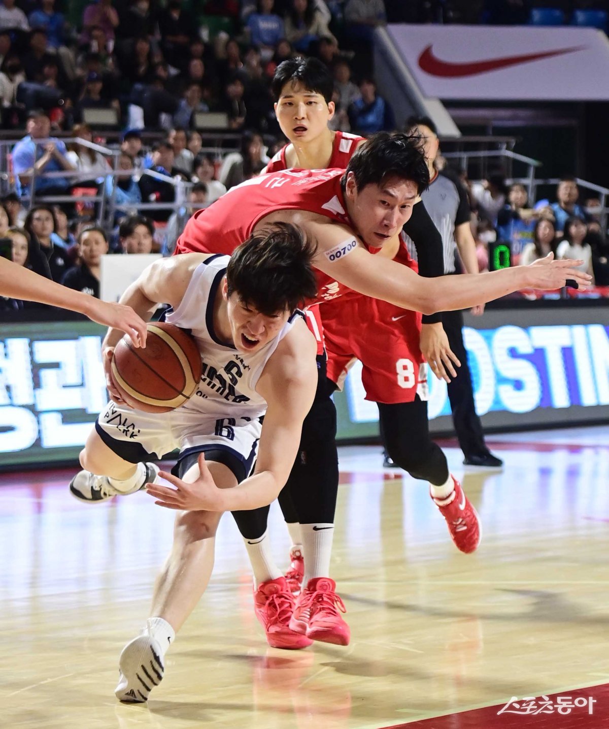 19일 서울 잠실학생체육관에서 열린 ‘2023-2024 정관장 프로농구’ 서울 SK와 고양 소노의 경기에서 소노 이정현이 SK 오세근으로부터 반칙을 당하고 있다.