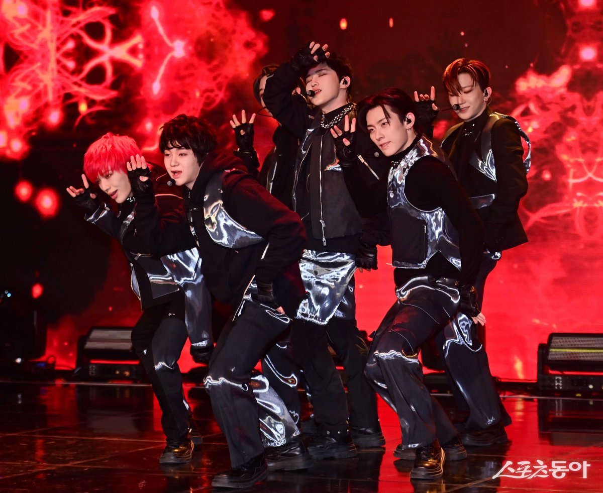 그룹 더뉴식스(The New Six)가 20일 서울 강남구 청담동 일지아트홀에서 열린 첫 번째 디지털 싱글 앨범 ‘푸에고(Fuego)’ 발매 기념 프레스 쇼케이스에서 동명의 타이틀곡 무대를 펼치고 있다. 주현희 기자 teth1147@donga.com