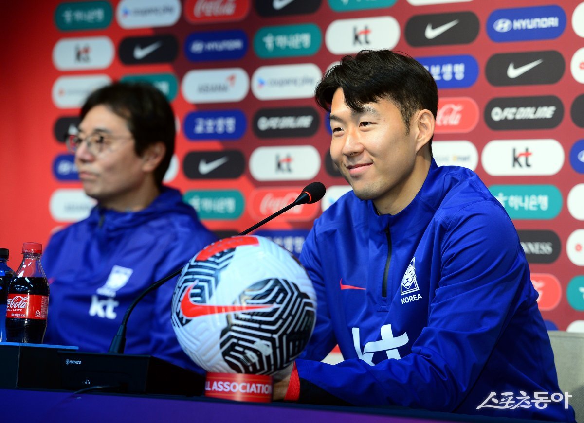 ‘2026 북중미 월드컵’ 아시아 2차예선 한국과 태국의 경기에 앞서 20일 서울 마포구 서울월드컵경기장에서 한국축구대표팀의 공식 기자회견이 열렸다. 한국축구대표팀 손흥민이 인터뷰도중 미소를 짓고 있다.
