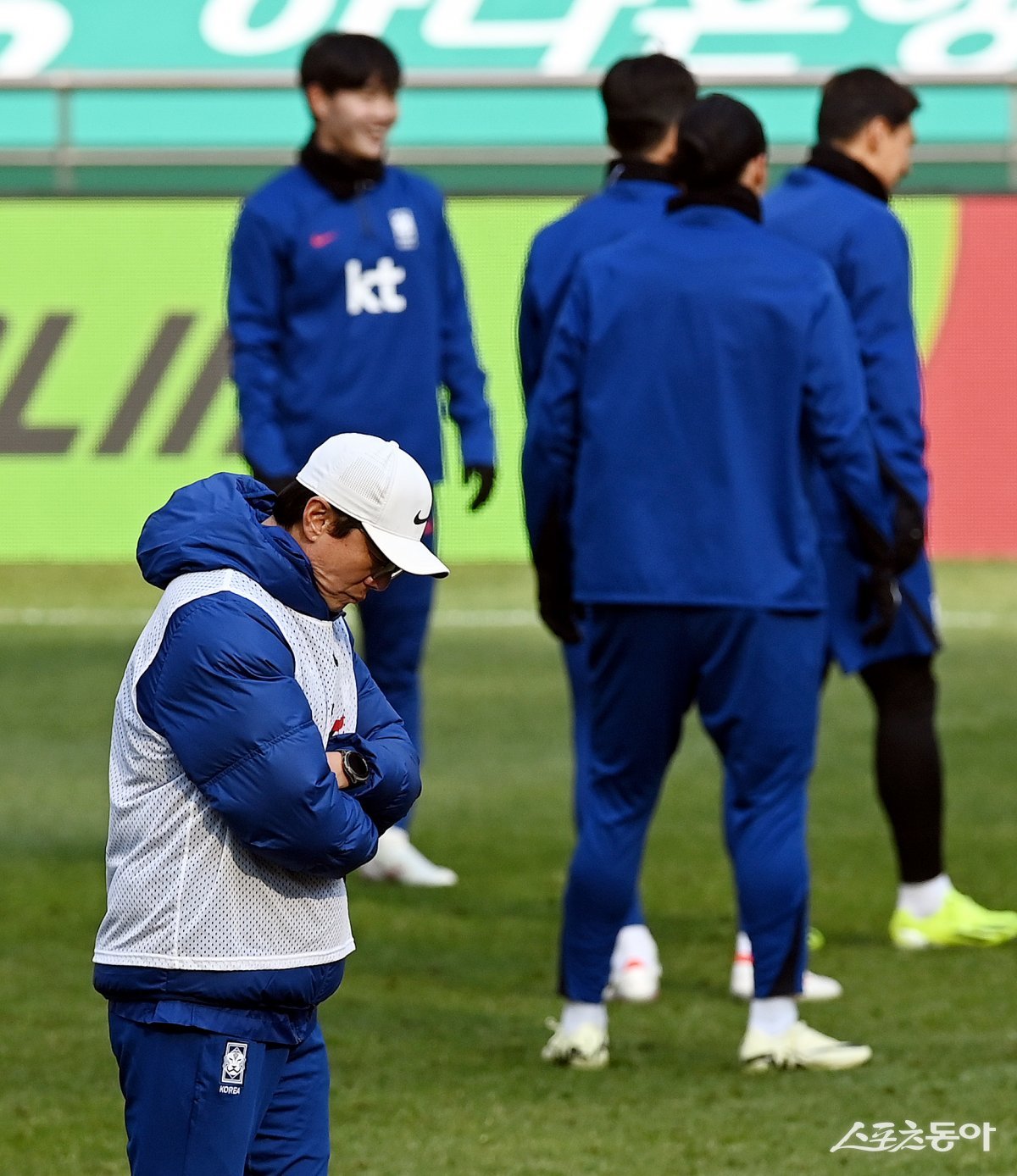 ‘2026 북중미 월드컵’ 아시아 2차예선 한국과 태국의 경기에 앞서 20일 서울 마포구 서울월드컵경기장에서 한국축구대표팀이 공식 훈련을 가졌다. 한국축구대표팀 황선홍 감독이 생각에 잠겨 있다.