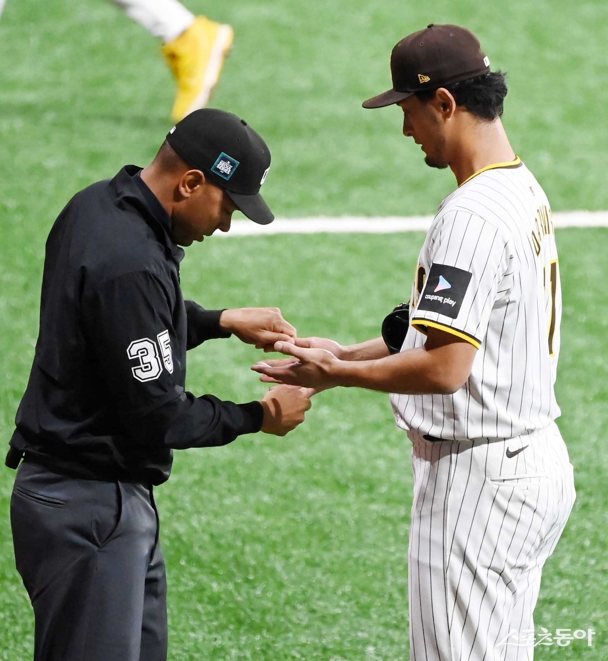20일 서울 고척스카이돔에서 열린 ‘메이저리그 월드투어 서울시리즈 2024’ LA 다저스와 샌디에이고 파드리스의 개막 경기에서 1회초 수비를 마친 샌디에이고 다르빗슈 유가 이물질 검사를 받고 있다.