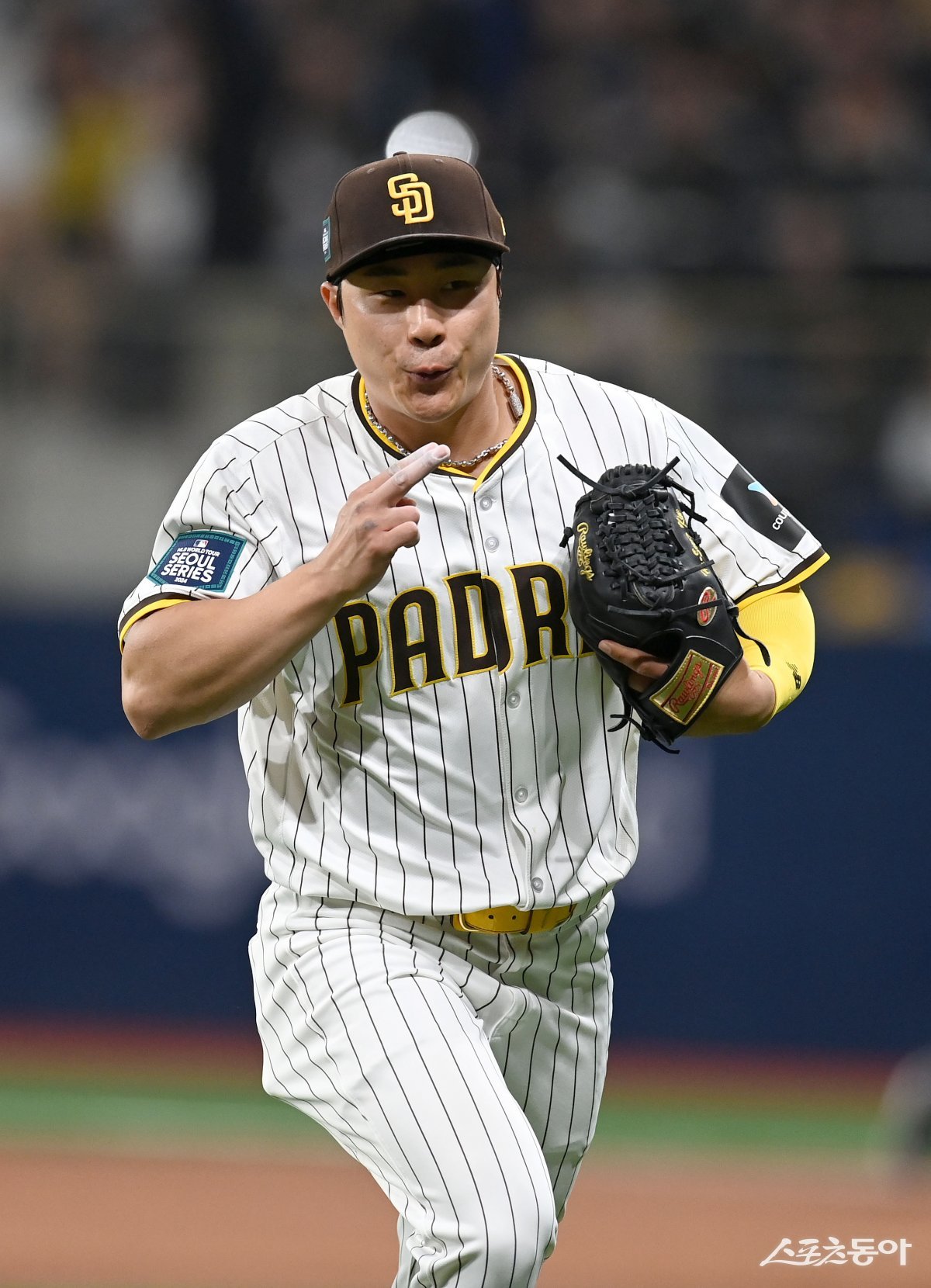 20일 서울 고척스카이돔에서 ‘메이저리그 월드투어 서울시리즈 2024’ LA 다저스와 SD 파드리스 열렸다. 샌디에이고 김하성이 4회초 2사 호수비를 펼친 후 기뻐하고 있다.