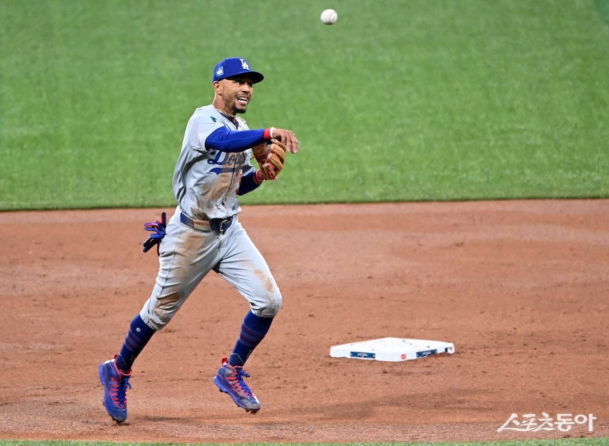 20일 서울 고척스카이돔에서 열린 ‘메이저리그 월드투어 서울시리즈 2024’ LA 다저스와 샌디에이고 파드리스의 개막 경기에서 2회말 샌디에이고의 땅볼 때 LA 무키 배츠가 1루로 송구하고 있다.