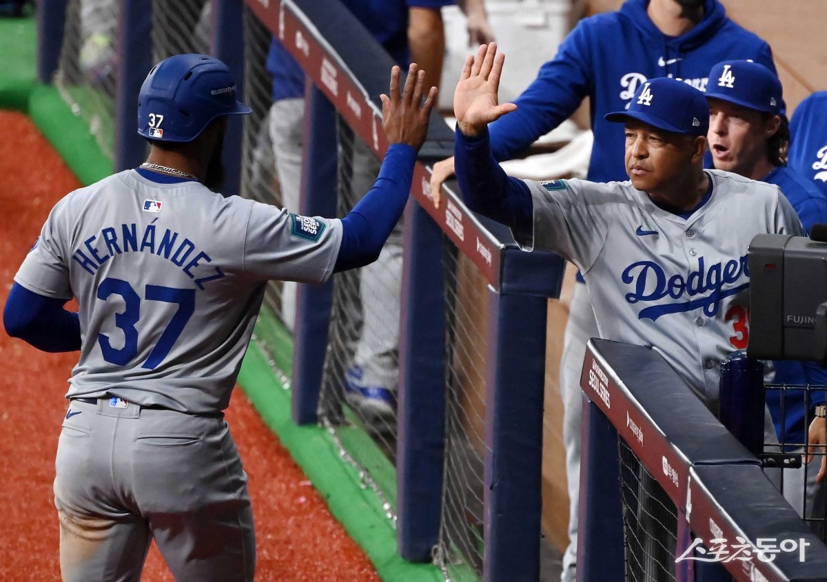 20일 서울 고척스카이돔에서 열린 ‘메이저리그 월드투어 서울시리즈 2024’ LA 다저스와 샌디에이고 파드리스의 개막 경기에서 4회초 1사 3루 LA의 희생타 때 3루주자 에르난데스가 동점 득점에 성공한 후 로버츠 감독의 축하를 받고 있다.