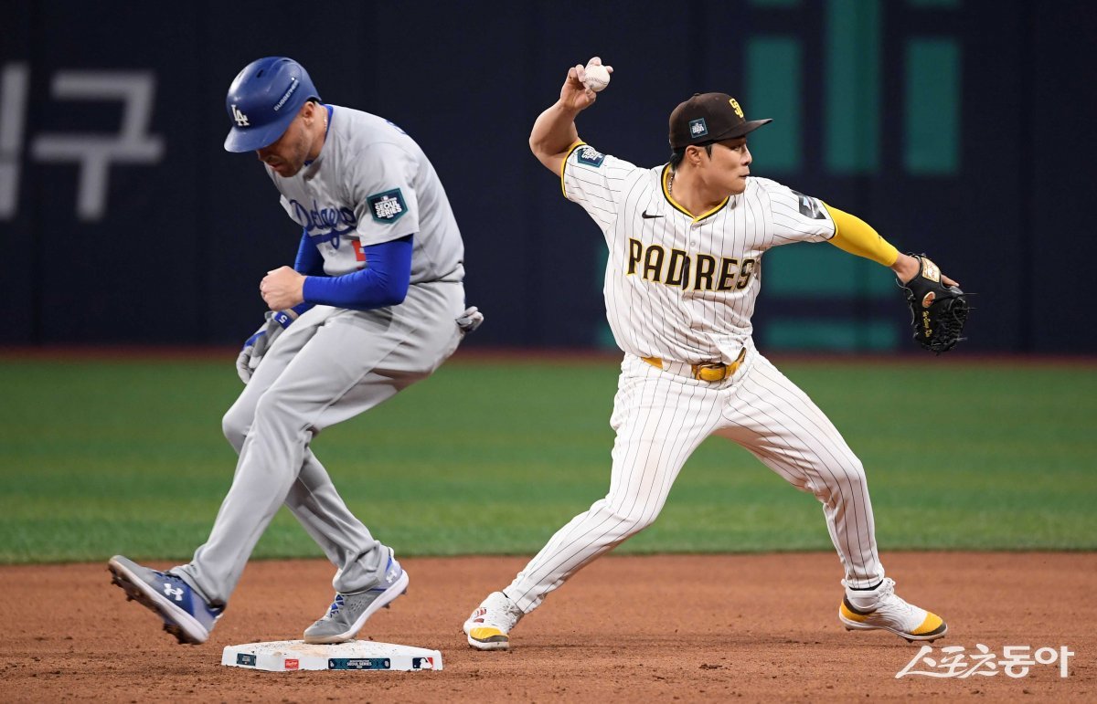 20일 서울 고척스카이돔에서 열린 ‘메이저리그 월드투어 서울시리즈 2024’ LA 다저스와 샌디에이고 파드리스의 개막 경기에서 7회초 1사 1, 2루 LA의 땅볼 때 샌디에이고 김하성이 1루주자를 포스 아웃시킨 후 1루로 송구하고 있다.