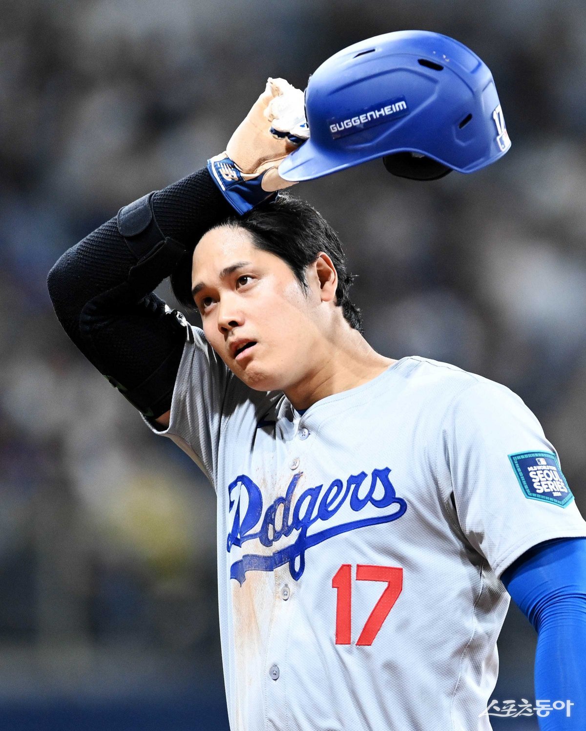 20일 서울 고척스카이돔에서 열린 ‘메이저리그 월드투어 서울시리즈 2024’ LA 다저스와 샌디에이고 파드리스의 개막 경기에서 8회초 1사 1, 2루 LA의 뜬공 때 귀루 과정에서 2루를 밟지 않은 오타니가 아웃당하고 있다. 고척 | 김종원 기자 won@donga.com