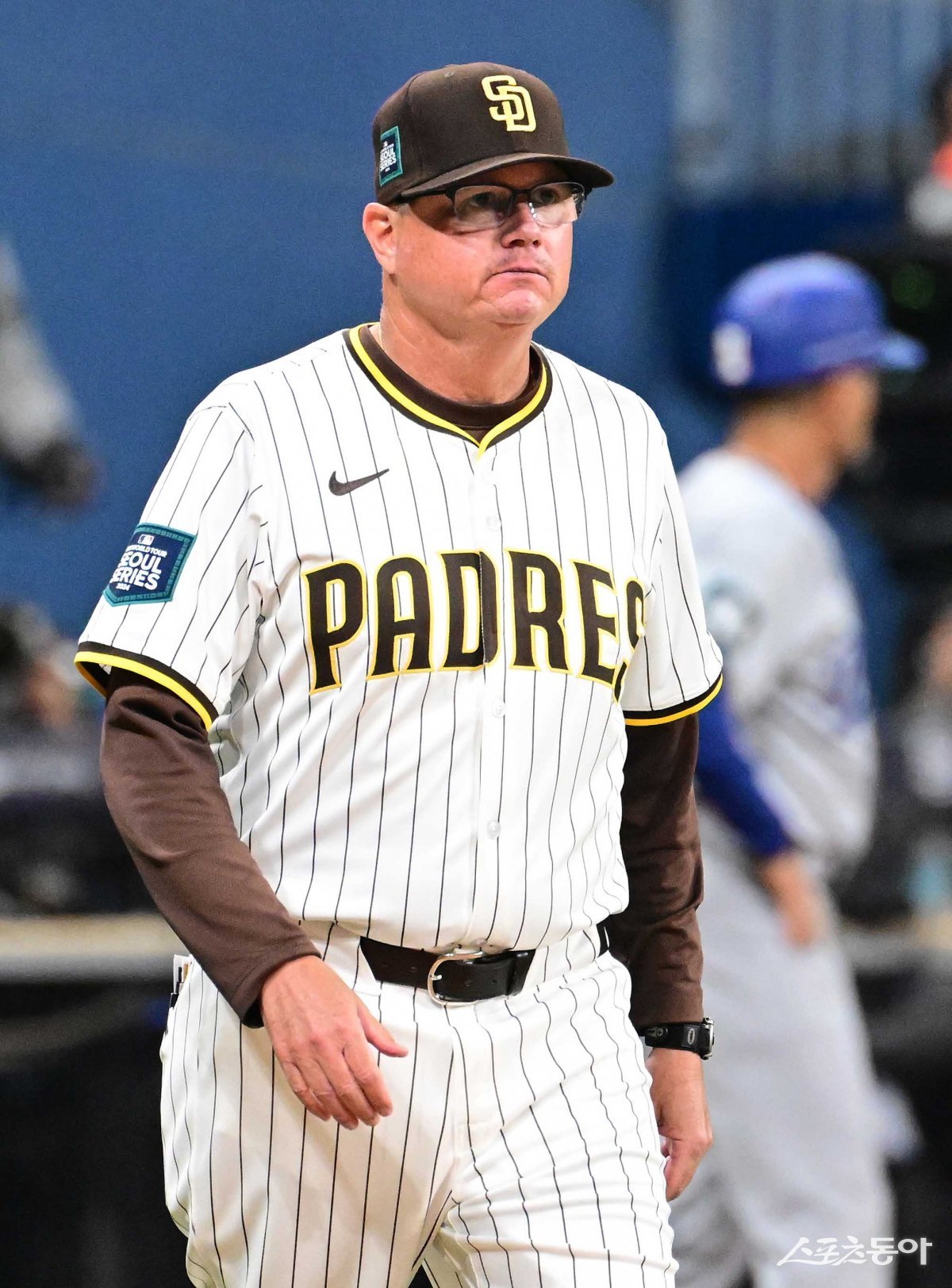 20일 서울 고척스카이돔에서 열린 ‘메이저리그 월드투어 서울시리즈 2024’ LA 다저스와 샌디에이고 파드리스의 개막 경기에서 5회초 1사 1, 2루 상황에서 샌디에이고 마이크 실트 감독이 마운드에 오르고 있다. 고척 | 김종원 기자 won@donga.com