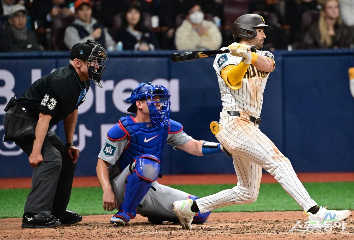 20일 서울 고척스카이돔에서 열린 ‘메이저리그 월드투어 서울시리즈 2024’ LA 다저스와 샌디에이고 파드리스의 개막 경기에서 7회말 2사 샌디에이고 웨이드가 안타를 치고 있다. 고척 | 김종원 기자 won@donga.com