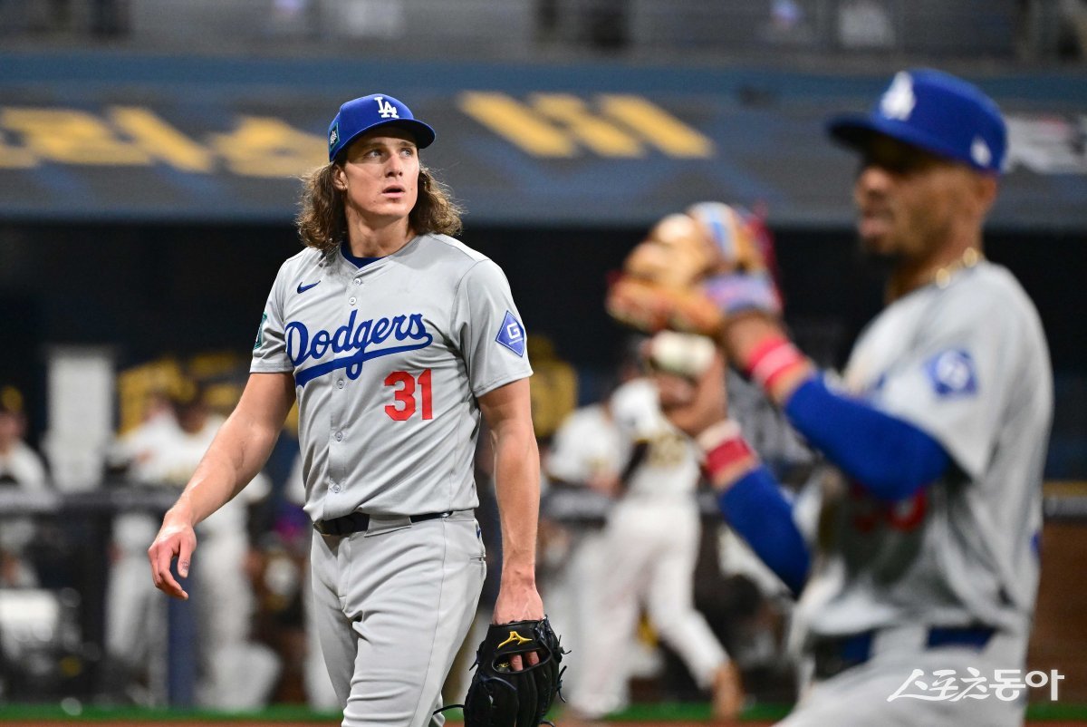 20일 서울 고척스카이돔에서 열린 ‘메이저리그 월드투어 서울시리즈 2024’ LA 다저스와 샌디에이고 파드리스의 개막 경기에서 5회말 수비를 마친 LA 글라스노우가 더그아웃으로 향하고 있다. 고척 | 김종원 기자 won@donga.com