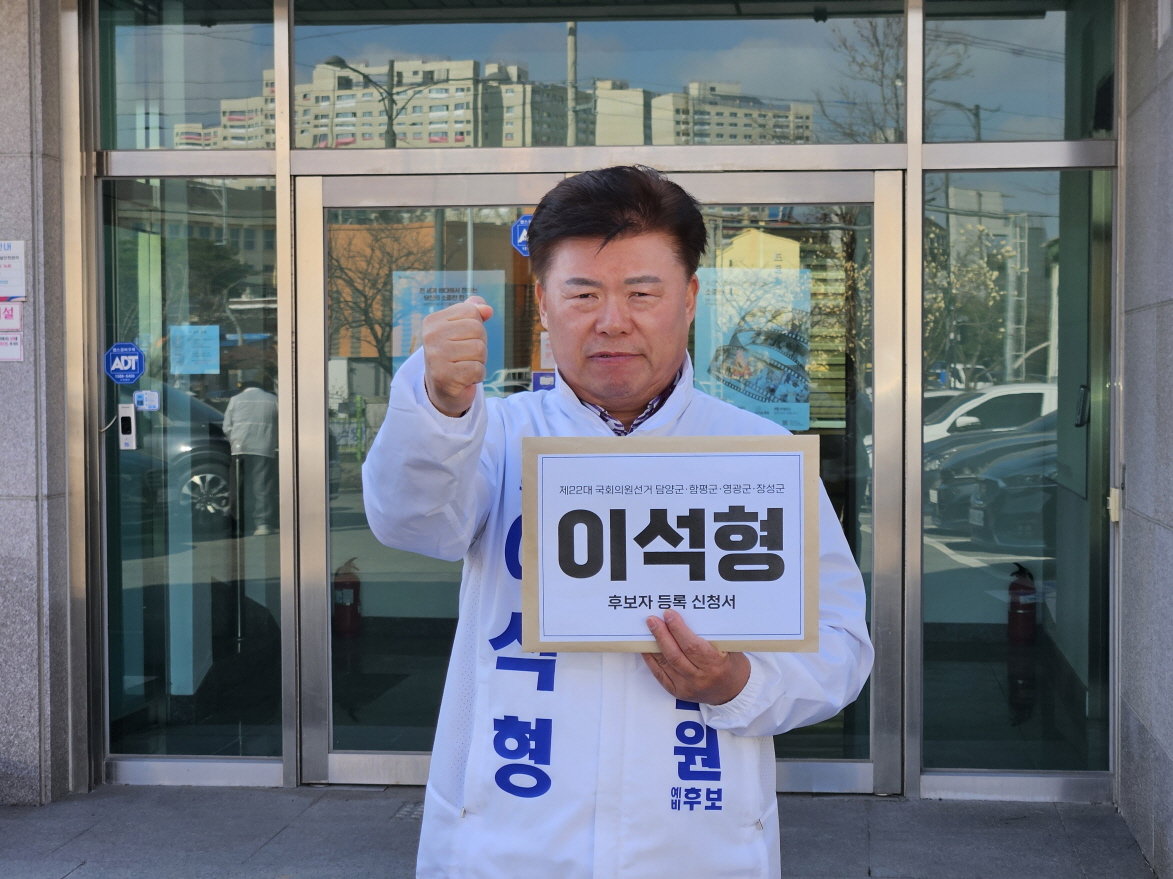 이석형 전 41·42·43대 함평군수가 21일 오전 영광군선거관리위원회에 방문해 담양군·함평군·영광군·장성군 제22대 국회의원 선거에 정식으로 무소속 후보자 등록을 마치고 본격적인 선거운동에 돌입했다.이석형 후보는 함평군 학교면 출생으로 3선 함평군수를 지냈던 경력과 재선 산림조합중앙회 회장을 역임하며 ‘나비축제’로 대표되는 혁신적인 면모와 전국 단위의 네트워크, 현장 중심의 해결사적 면모를 갖췄다는 평가를 받고 있다.