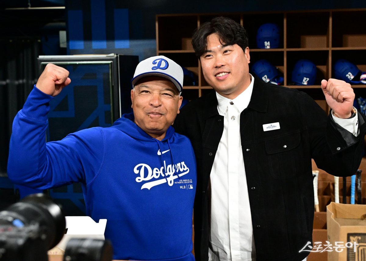 데이브 로버츠 감독(왼쪽)·류현진. 스포츠동아DB
