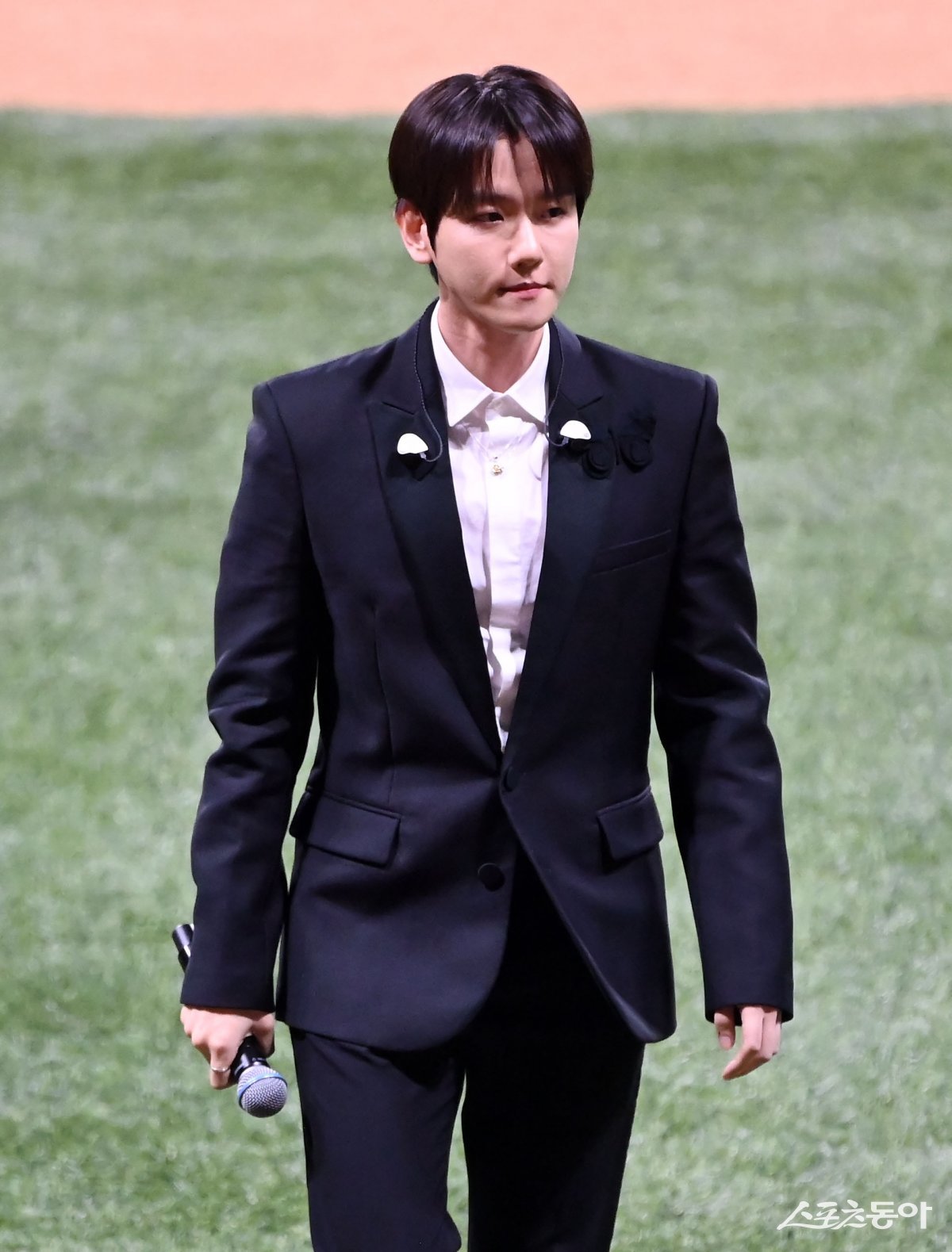 21일 서울 고척스카이돔에서 ‘메이저리그 월드투어 서울시리즈 2024’ SD 파드리스와 LA 다저스 열렸다. 백현이 양국 국가를 부른뒤 그라운드를 나서고 있다.
