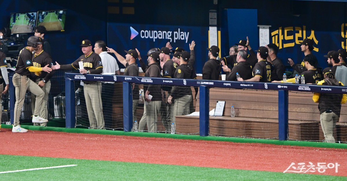21일 서울 구로구 고척스카이돔에서 열린 2024 미국 메이저리그(MLB) 월드투어 서울시리즈 공식 개막전 샌디에이고 파드리스와 LA 다저스의 2차전 경기, 샌디에이고 3회초 1사 만루 젠더 보가츠의 2타점 우전 적시타를 날린 후 득아웃에서 환영받고 있다.
