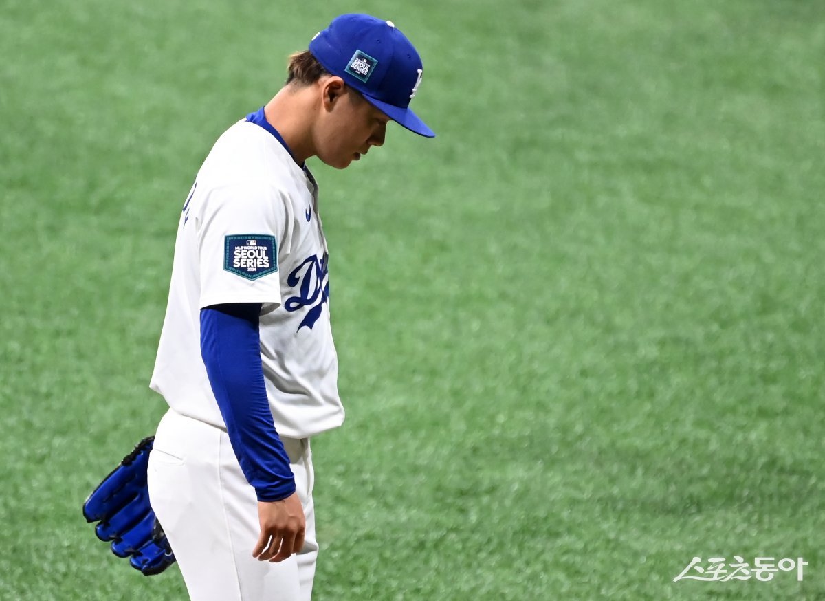 21일 서울 고척스카이돔에서 ‘메이저리그 월드투어 서울시리즈 2024’ SD 파드리스와 LA 다저스 열렸다. 선발투수로 등판한 LA 다저스 야마모토가 5실점으로 이닝 마친 후 마운드를 내려오고 있다.