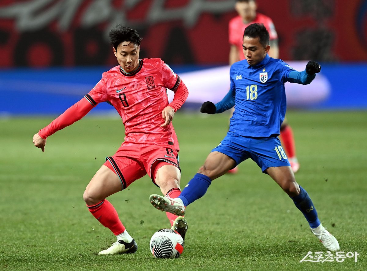 21일 서울 마포구 서울월드컵경기장에서 ‘2026 북중미 월드컵’ 아시아예선 한국과 태국의 경기에서 한국 백승호가 태국 선수와 볼 다툼을 벌이고 있다.