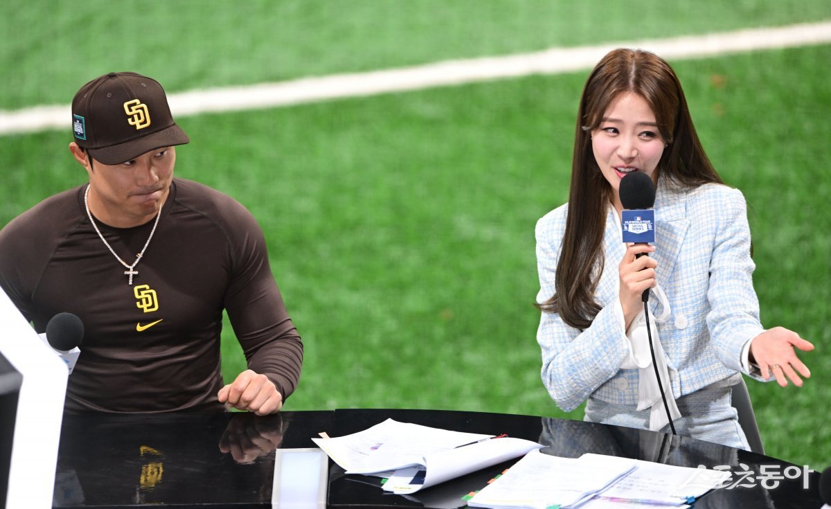 21일 서울 고척스카이돔에서 ‘메이저리그 월드투어 서울시리즈 2024’ SD 파드리스와 LA 다저스 열렸다. 샌디에이고 김하성과 배지현 아나운서가 프리뷰를 하고 있다.