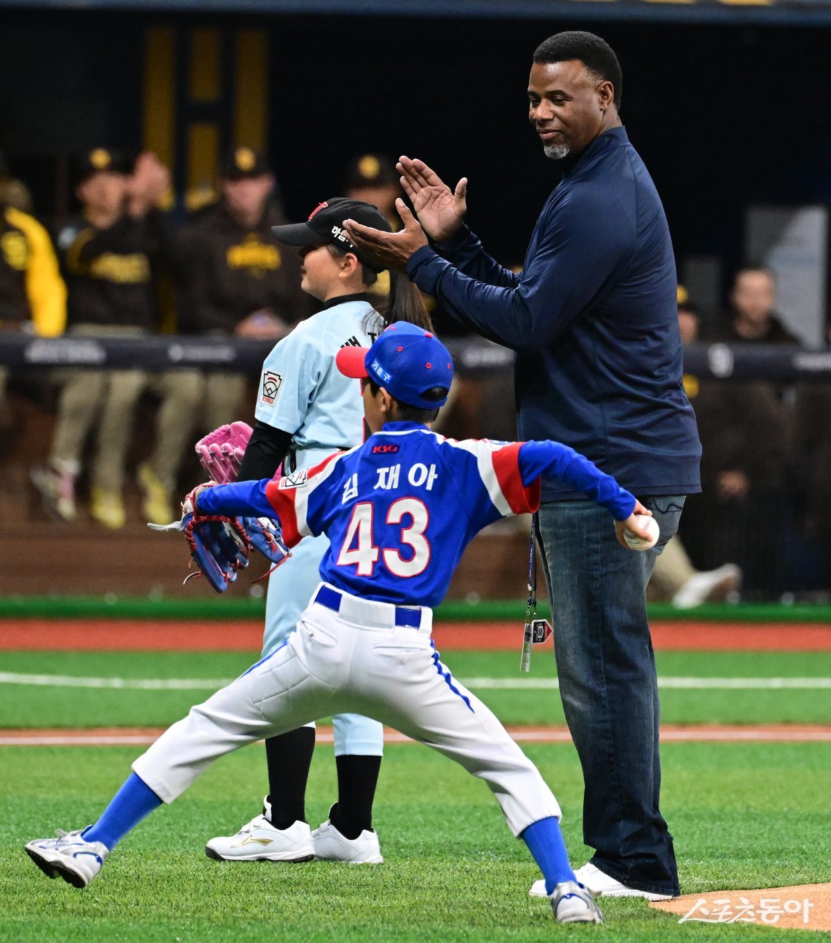 21일 서울 구로구 고척스카이돔에서 열린 2024 미국 메이저리그(MLB) 월드투어 서울시리즈 공식 개막 2차전 샌디에이고 파드리스와 LA 다저스의 2차전 경기, 메이저리그 레전드 켄 그리피 주니어가 한국 유소년 야구 어린이의 시구를 지켜보고 있다.