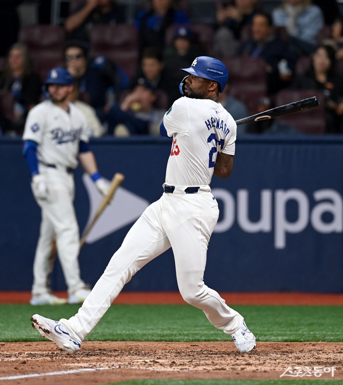 21일 서울 고척스카이돔에서 ‘메이저리그 월드투어 서울시리즈 2024’ SD 파드리스와 LA 다저스 열렸다. 3회말 2사 3루 LA 다저스 헤이워드가 1타점 중전 안타를 치고 있다.