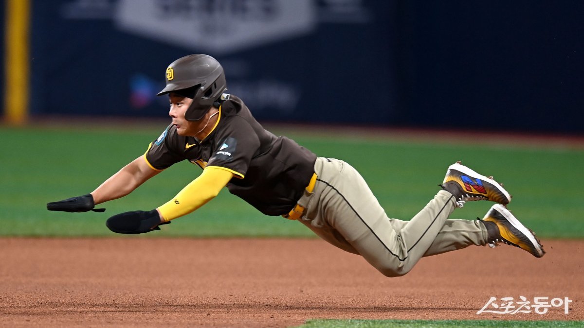 21일 서울 고척스카이돔에서 ‘메이저리그 월드투어 서울시리즈 2024’ SD 파드리스와 LA 다저스 열렸다. 4회초 1사 1루 샌디에이고 1루주자 김하성이 2루 도루에 성공하고 있다.