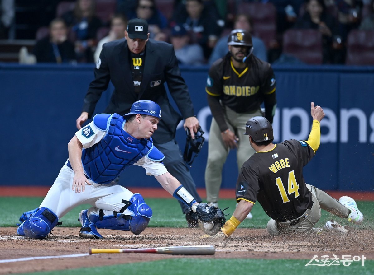 21일 서울 고척스카이돔에서 ‘메이저리그 월드투어 서울시리즈 2024’ SD 파드리스와 LA 다저스 열렸다. 3회초 1사 만루 샌디에이고 안타 때 2루주자 웨이드가 득점에 성공하고 있다.