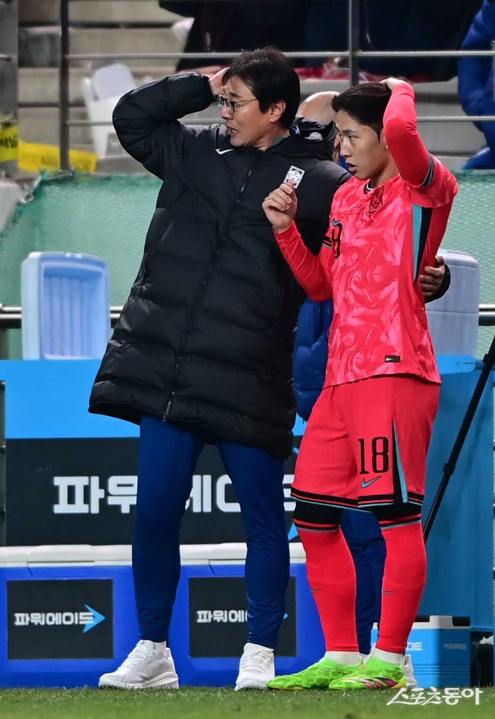 21일 서울월드컵경기장에서 열린 ‘2026 FIFA 북중미 월드컵’ 아시아지역 2차 예선전 한국과 태국의 경기에서 태국의 동점골에 한국 황선홍 감독이 아쉬워하고 있다.