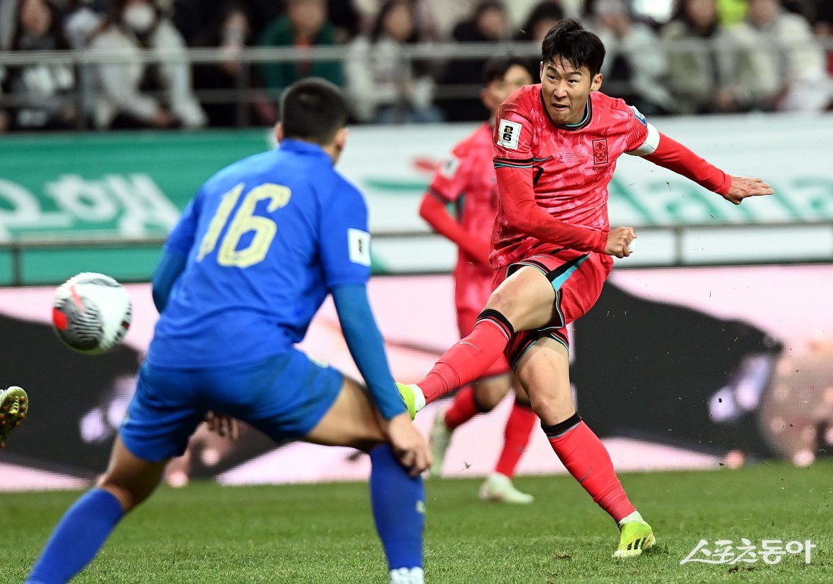 21일 서울 마포구 서울월드컵경기장에서 ‘2026 북중미 월드컵’ 아시아예선 한국과 태국의 경기에서 한국 손흥민이 슛을 날리고 있다.