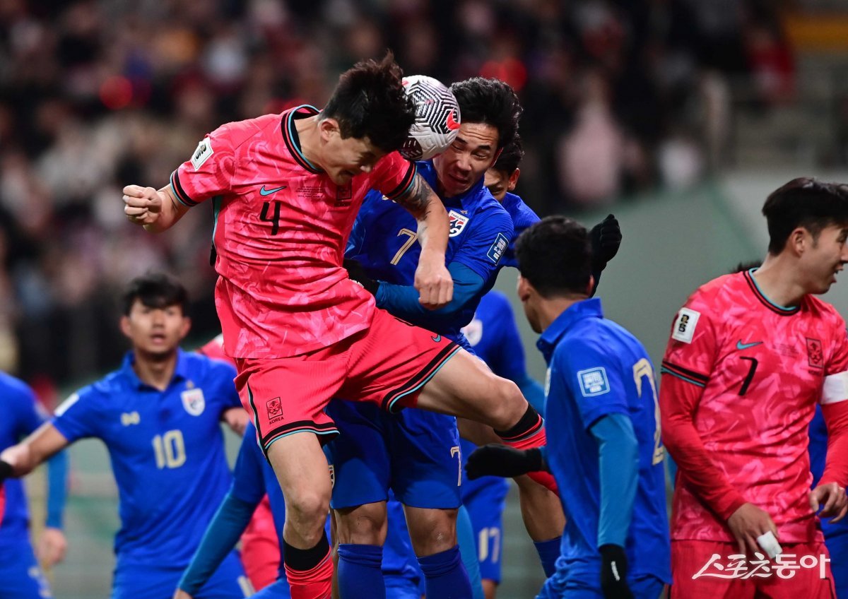 21일 서울월드컵경기장에서 열린 ‘2026 FIFA 북중미 월드컵’ 아시아지역 2차 예선전 한국과 태국의 경기에서 한국 김민재가 헤딩슛을 하고 있다.