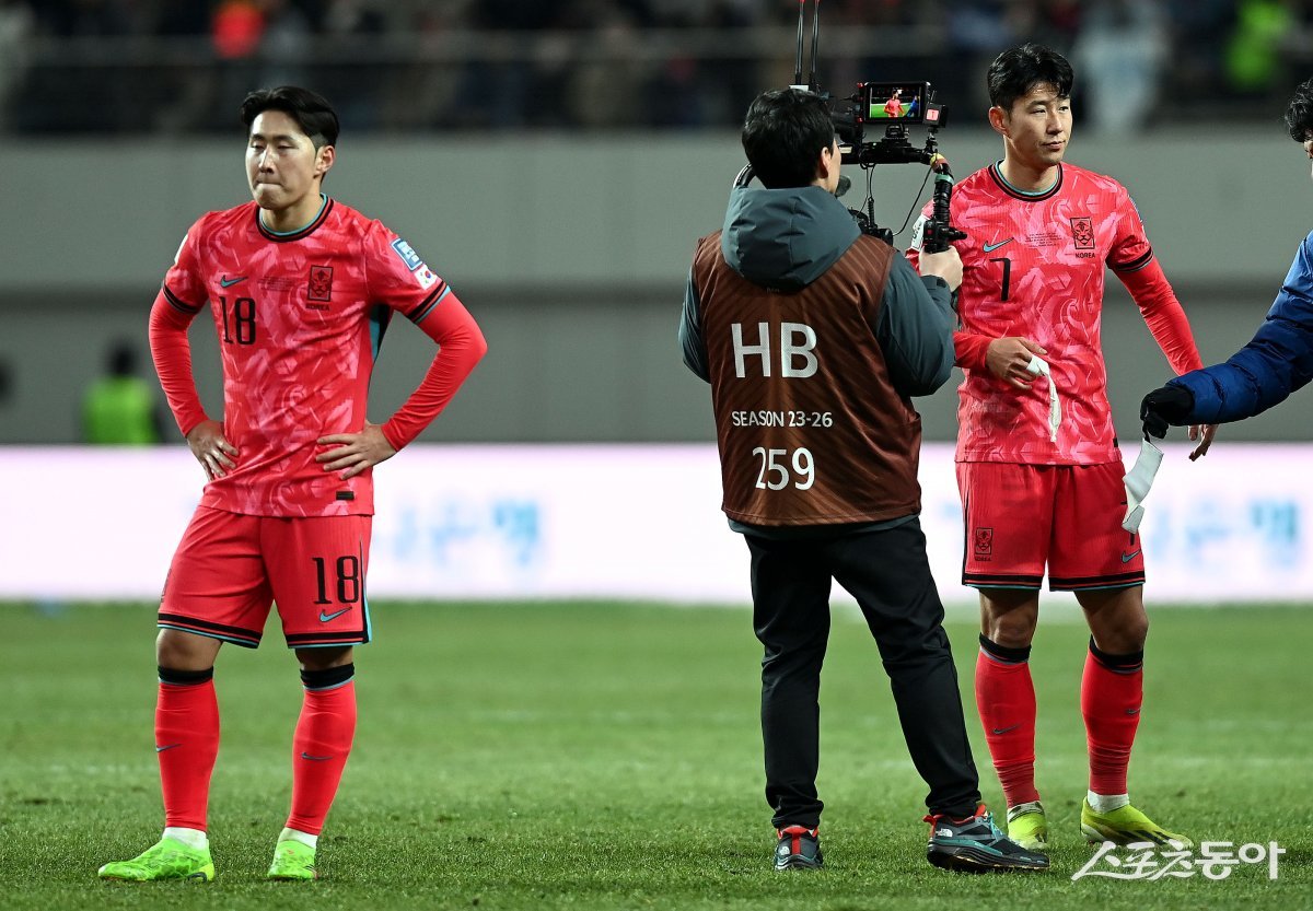 21일 서울 마포구 서울월드컵경기장에서 ‘2026 북중미 월드컵’ 아시아예선 한국과 태국의 경기에서 한국이 태국과 1-1 무승부를 기록한 후 이강인과 손흥민이 아쉬워하고 있다.