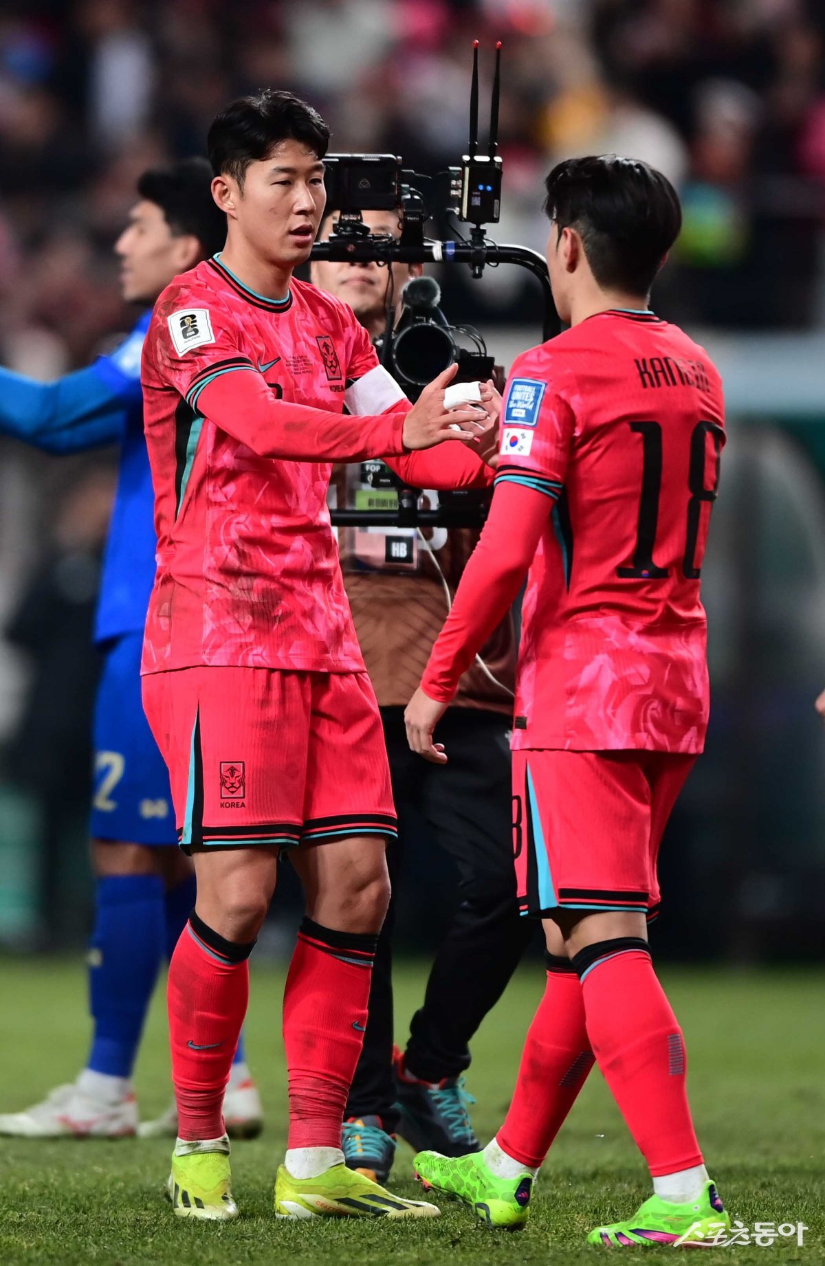 21일 서울월드컵경기장에서 열린 ‘2026 FIFA 북중미 월드컵’ 아시아지역 2차 예선전 한국과 태국의 경기에서 1-1로 무승부를 거둔 한국 손흥민이 이강인과 인사하고 있다.