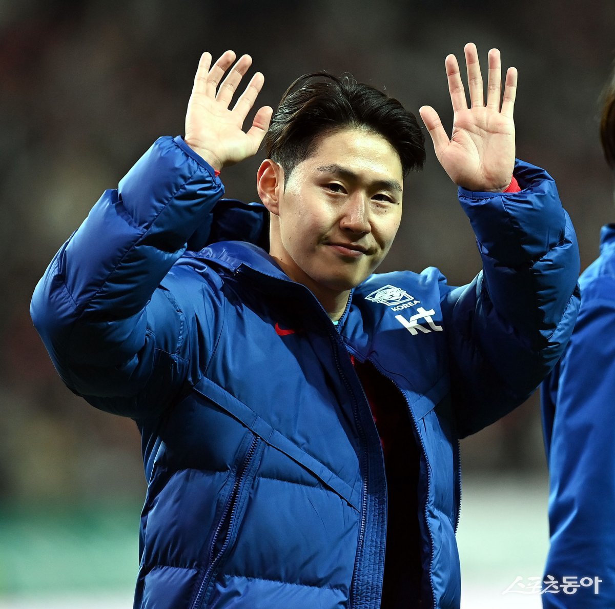 21일 서울 마포구 서울월드컵경기장에서 ‘2026 북중미 월드컵’ 아시아예선 한국과 태국의 경기에서 한국이 태국과 1-1 무승부를 기록한 후 이강인이 팬들에게 인사하고 있다.