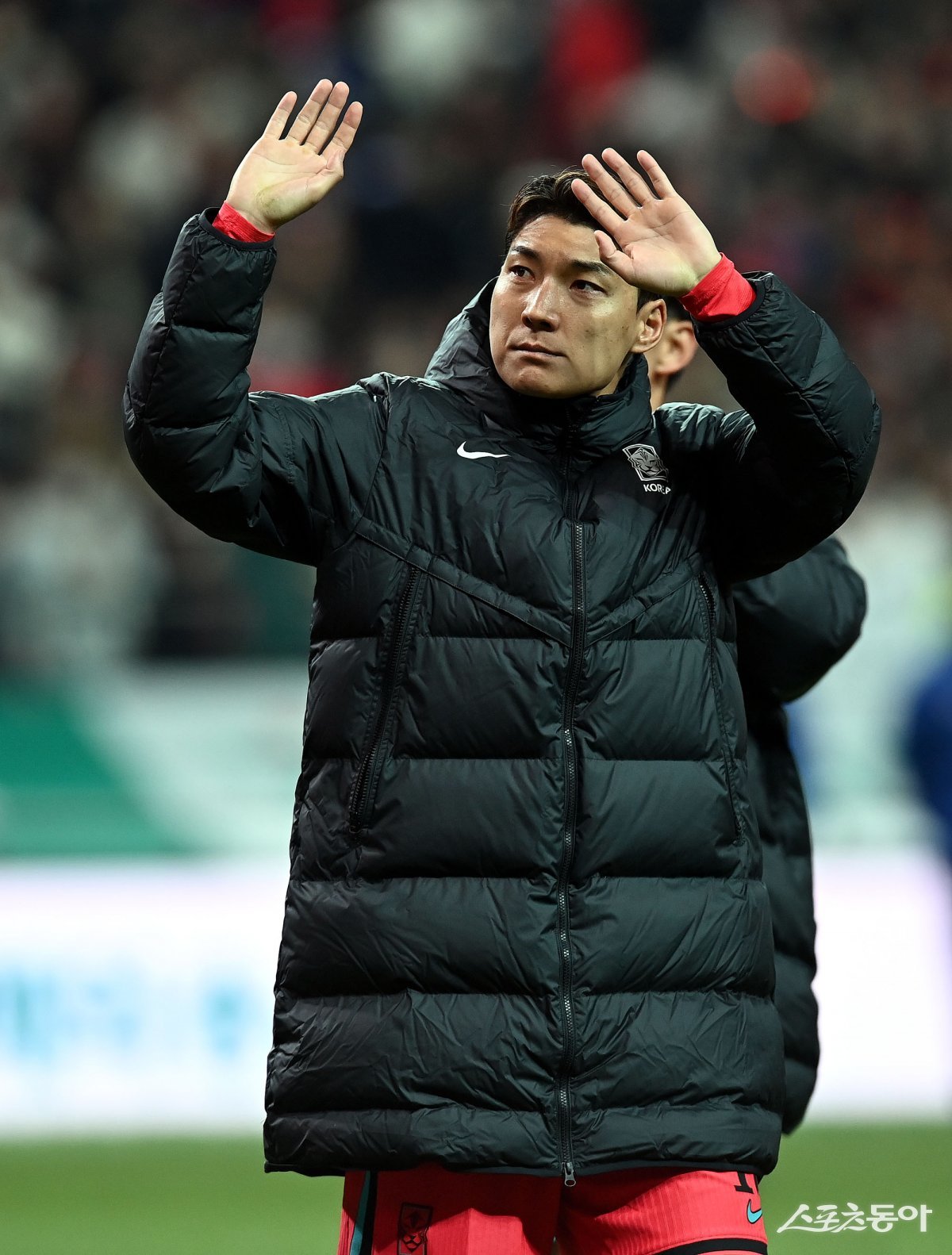 21일 서울 마포구 서울월드컵경기장에서 ‘2026 북중미 월드컵’ 아시아예선 한국과 태국의 경기에서 한국이 태국과 1-1 무승부를 기록한 후 주민규가 팬들에게 인사하고 있다.