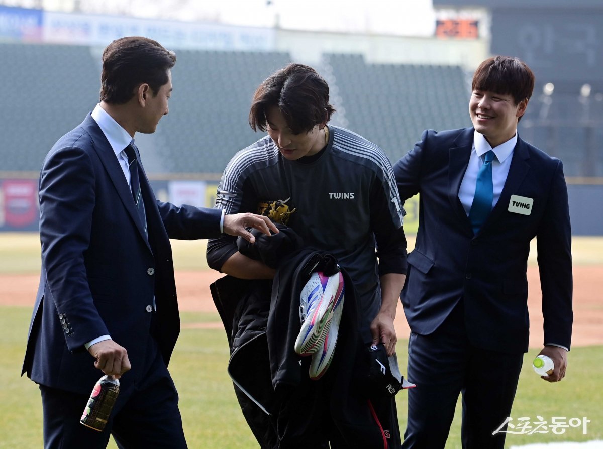 23일 서울 잠실야구장에서 열린 ‘2024 신한 SOL 뱅크 KBO리그’ LG 트윈스와 한화 이글스의 경기에 앞서 LG 최동환이 박용택 해설위원, 민병헌 해설위원과 인사하고 있다.