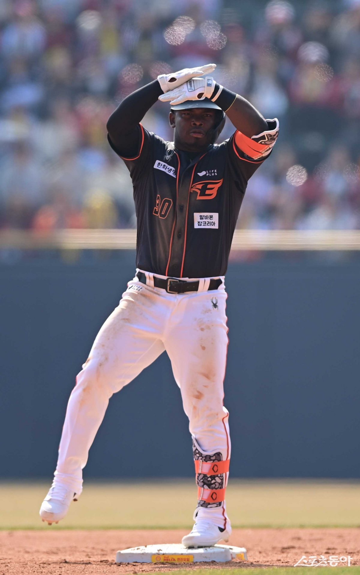 23일 서울 잠실야구장에서 열린 ‘2024 신한 SOL 뱅크 KBO리그’ LG 트윈스와 한화 이글스의 경기에서 3회초 1사 1, 3루 한화 페라자가 1타점 좌전 2루타를 친 후 세리머니를 하고 있다. 잠실 | 주현희 기자 teth1147@donga.com