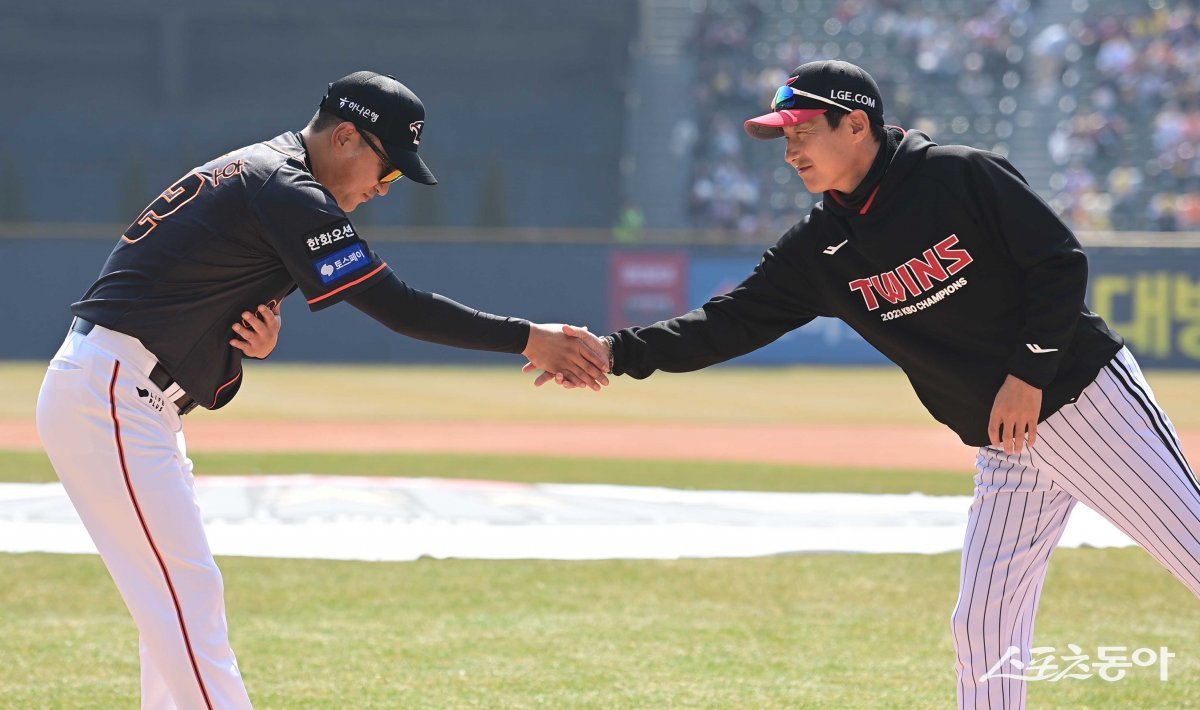 23일 서울 잠실야구장에서 열린 ‘2024 신한 SOL 뱅크 KBO리그’ LG 트윈스와 한화 이글스의 경기에 앞서 개막식에서 한화 최원호 감독과 LG 염경엽 감독이 인사하고 있다.